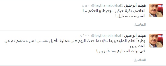 وأضاف أبو خليل، في تدوينة له على موقع التواصل الاجتماعي "توتير": أنه "وطبقاً لعلم الملوخيزيقا ..فإن ما حدث اليوم هي عملية تأهيل نفسي لمن عندهم دم من المصريين في براءة المخلوع بعد شهرين!"، ساخرًا: "القاضي بكرة حيكبر ..وحيطلع الحكم .. !السيسي ستايل".