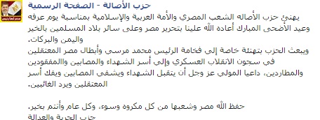 وبعث الحزب فى بيانه، اليوم، بتهنئة خاصة إلى الرئيس محمد مرسي، والمعتقلين في سجون الانقلاب العسكري، إضافة إلى أسر الشهداء والمصابين والمفقودين والمطاردين، داعيًا المولى عز وجل أن يتقبل الشهداء، ويشفي المصابين، ويفك أسر المعتقلين، ويرد الغائبين.