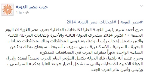 صرح أحمد غنيم، رئيس اللجنة العليا للانتخابات الداخلية بحزب مصر القوية، أن الجولة الثانية والأخيرة بانتخابات المرحلة الثانية والتى تشمل انتخاب رؤساء وأمناء ومندوبي المحافظات وذلك بمحافظات دمياط ، البحيرة ، الشرقية ، الإسكندرية ، بنى سويف ، أسيوط ، سوهاج ستجرى اليوم الجمعة ١٠ أكتوبر 2014 ،وذلك بدءً من الساعة الواحدة ظهراً بمقرات الحزب في المحافظات المذكورة.
