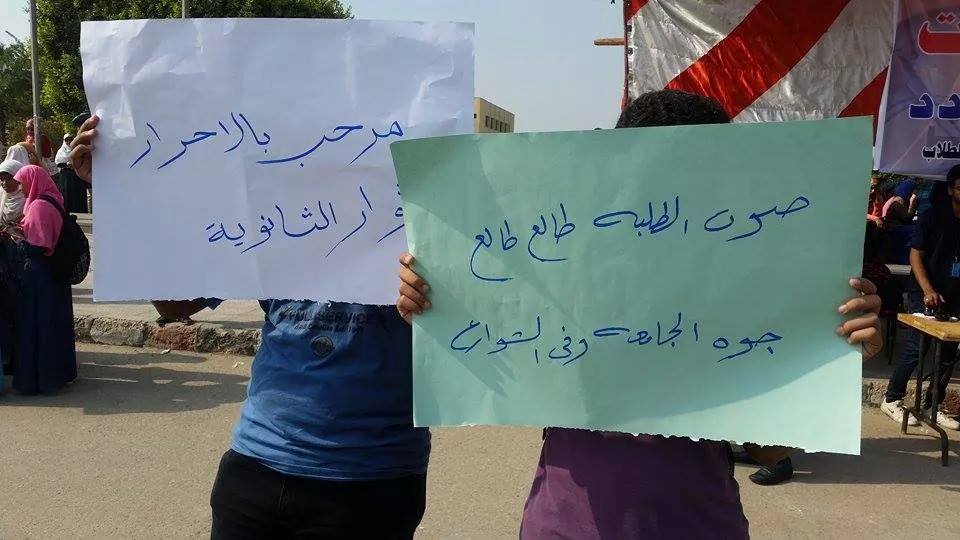 ورفع المشاركون بعض اللافتات التى تندد بقمع الحركة الطلابية والحرس الجامعي واعتقال الطلاب المستمر كما رفع الطلاب بعض اللافتات التى ترحب بالطلاب الجدد من الفرقة الأولى .