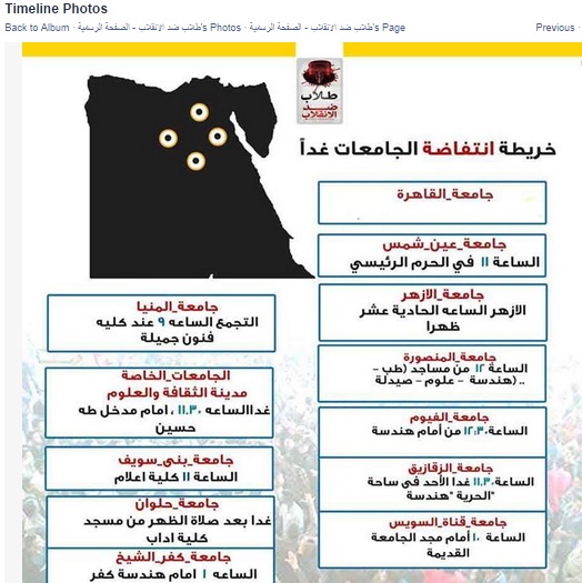 نشرت الصفحة الرسمية لحركة طلاب ضد الانقلاب، على موقع التواصل الاجتماعي "فيس بوك" خريطة فعاليات الحراك الطلابي اليوم، في الجامعات المصرية، والتي ستكون على النحو التالي: