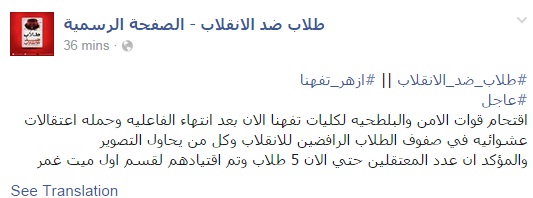 وبحسب الصفحة الرسمية لطلاب ضد الانقلاب على موقع التواصل الاجتماعي، فإن عدد المعتقلين حتى الآن بلغ 5 طلاب، تم اقتيادهم لقسم أول ميت غمر.