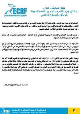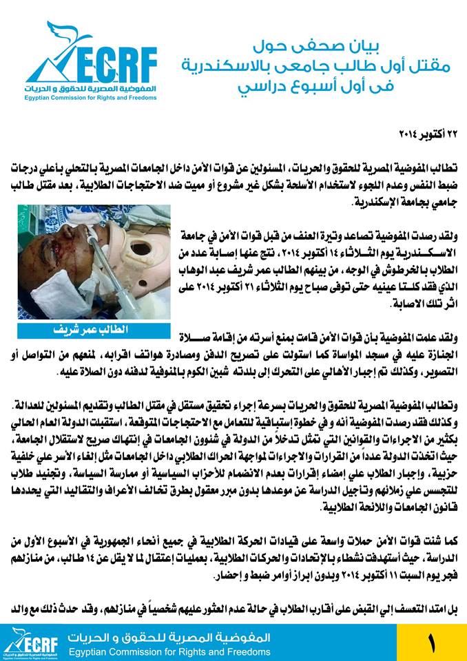 وأكدت المفوضية في بيان لها: "أنها رصدت تصاعد وتيرة العنف من قبل قوات الأمن في جامعة الاسكندرية يوم الثلاثاء 14 من أكتوبر 2014، نتج عنها إصابة عدد من الطلاب بالخرطوش في الوجه، من بينهم الطالب عمر شريف عبد الوهاب الذي فقد كلتا عينيه حتى توفي صباح يوم الثلاثاء 21 من أكتوبر 2014 على إثر تلك الاصابة".