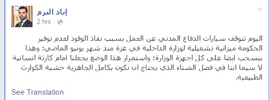 وقال البزم في تدوينة عبر صفحته الرسمية على موقع التواصل الاجتماعي "فيس بوك": "اليوم تتوقف سيارات الدفاع المدني عن العمل؛ بسبب نفاذ الوقود لعدم توفير الحكومة ميزانية تشغيلية لوزارة الداخلية في غزة، منذ شهر يونيو الماضي".