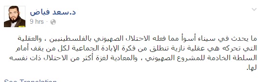 وقال فياض في تدوينة عبر صفحته على موقع التواصل الاجتماعي "فيس بوك": "ما يحدث في سيناء أسوأ مما فعله الاحتلال الصهيوني بالفلسطينيين، والعقلية التي تحركه هي عقلية نازية تنطلق من فكرة الإبادة الجماعية لكل من يقف أمام السلطة الخادمة للمشروع الصهيوني، والمعادية لغزة أكثر من الاحتلال ذات نفسه لها".