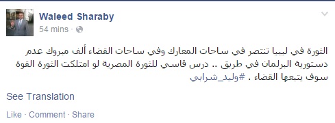 وقال شرابي في تدوينة عبر صفحته على موقع التواصل الاجتماعي "فيس بوك": "الثورة في ليبيا تنتصر في ساحات المعارك وفي ساحات القضاء، ألف مبروك عدم دستورية البرلمان في طربق .. درس قاسي للثورة المصرية، لو امتلكت الثورة القوة سوف يتبعها القضاء".
