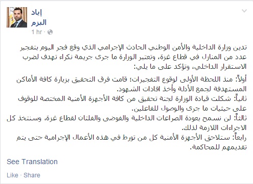أدانت وزارة الداخلية والأمن الوطني الفلسطينية الحادث الإجرامي الذي وقع فجر اليوم الجمعة، بتفجير عدد من المنازل في قطاع غزة، معتبرة ما جرى جريمة نكراء تهدف لضرب الاستقرار الداخلي.