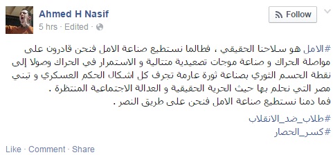 وقال ناصف في تدوينة عبر صفحته على موقع التواصل الاجتماعي "فيس بوك": "الأمل هو سلاحنا الحقيقي، فطالما نستطيع صناعة الأمل، فنحن قادرون على مواصلة الحراك، وصناعة موجات تصعيدية متتالية، والاستمرار في الحراك وصولًا إلى نقطة الحسم الثوري بصناعة ثورة عارمة تجرف كل أشكال الحكم العسكري، وتبني مصر التي نحلم بها حيث الحرية الحقيقية والعدالة الاجتماعية المنتظرة".