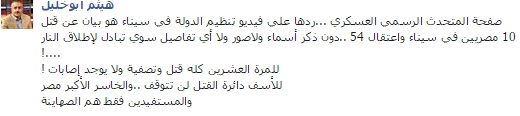 وقال أبوخليل في تدوينة عبر صفحته على موقع التواصل الاجتماعي "فيس بوك": "صفحة المتحدث الرسمي العسكري، ردها على فيديو تنظيم الدولة في سيناء، هو بيان عن قتل 10 مصريين في سيناء، واعتقال 54، دون ذكر أسماء ولا صور، ولا أي تفاصيل سوى تبادل لإطلاق النار!".