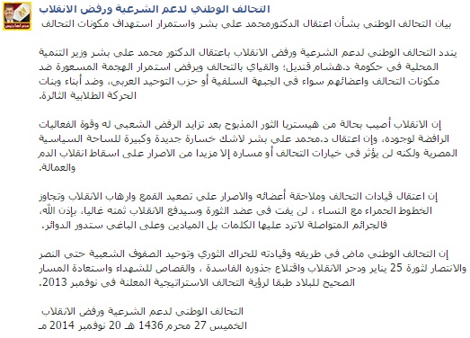 وأكد التحالف الوطني أنه "ماض في طريقه وقيادته للحراك الثوري وتوحيد الصفوف الشعبية حتي النصر والانتصار لثورة 25 يناير ودحر الانقلاب واقتلاع جذوره الفاسدة، والقصاص للشهداء واستعادة المسار الصحيح للبلاد؛ طبقا لرؤية التحالف الإستراتيجية المعلنة في نوفمبر 2013".