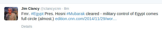 علق جيم كلانسي كبير مراسلي شبكة "سي إن إن" الأمريكية على حكم تبرئة الرئيس المخلوع حسني مبارك وآخرين من قتل متظاهري 25 يناير واتهامات فساد أخرى بأنه يمثل اكتمالا للسيطرة العسكرية في مصر.