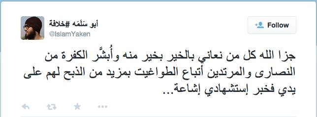 وأضاف: "جزى الله كل من نعاني بالخير بخير منه، وأُبشَّر الكفرة من النصارى، والمرتدين أتباع الطواغيت بمزيد من الذبح لهم على يدي".