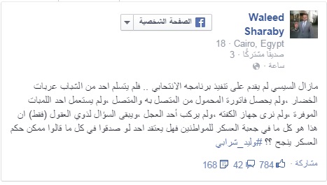 وأضاف شرابي عبر صفحته الشخصية على مواقع التواصل الاجتماعي "فيس بوك": "لم يتسلم أحد من الشباب عربات الخضار ،ولم يحصل فاتورة المحمول من المتصل به والمتصل ،ولم يستعمل أحد اللمبات الموفرة ،ولم نرى جهاز الكفتة ،ولم يركب أحد العجل."