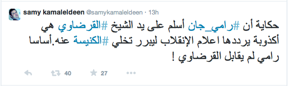 قال الإعلامي سامي كمال الدين مقدم البرامج على قناة "آلشرق" الفضائية إن حكاية أن الناشط القبطي رامي جان أسلم على يد العلامة الشيخ يوسف القرضاوي أكذوبة يرددها إعلام الانقلاب ليبرر تخلي الكنيسة عنه.