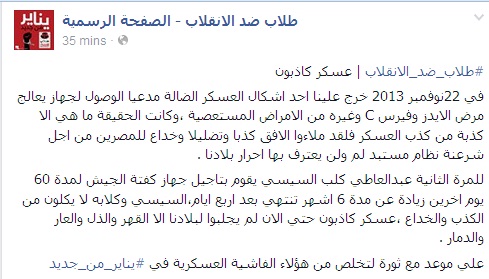 وقالت الحركة في تدوينة لها عبر صفحتها الرسمية على موقع التواصل الاجتماعي "فيس بوك": "في22نوفمبر 2013 خرج علينا أحد أشكال العسكر الضالة مدعيًا الوصول لجهاز يعالج مرض الإيدز وفيرس Cوغيره من الأمراض المستعصية، وكانت الحقيقة ما هي الإ كذبة من كذب العسكر فلقد ملاءوا الأفق كذبًا وتضليلًا وخداع للمصرين من أجل شرعنة نظام مستبد لم ولن يعترف بها أحرار بلادنا".