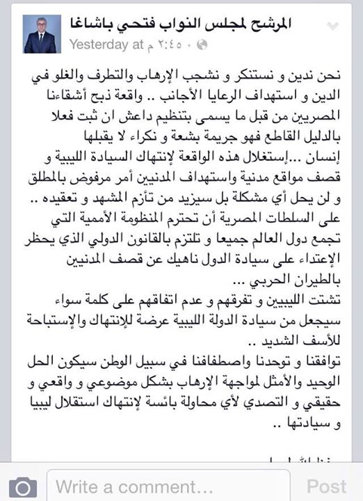 أدان النائب بالمؤتمر الوطني الليبي بمصراتة، فتحي باشاغا، الهجوم الجوي المصري على الأراضي الليبية، الإثنين الماضي، داعيًا مصر احترام المنظومة الأممية التي تجمع دول العالم جميعًا، ومطالبًا إياها بالالتزام بالقانون الدولي الذي يحظر الاعتداء على سيادة الدول وقصف المدنيين بالطيران الحربي.