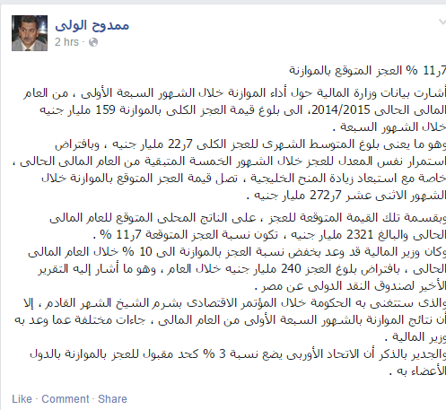 وكان الخبير الاقتصادي ورئيس مجلس ادارة الأهرام السابق ممدوح الولي علق علي البيان الذي نشرته المالية عبر موقعها الالكتروني، قائلا: إن هذا يعنى بلوغ المتوسط الشهرى للعجز الكلى 22.7 مليار جنيه، وبافتراض استمرار نفس المعدل للعجز خلال الشهور الخمسة المتبقية من العام المالى الحالى، خاصة مع استبعاد زيادة المنح الخليجية ، تصل قيمة العجز المتوقع بالموازنة خلال الشهور الاثنى عشر 272.7 مليار جنيه .