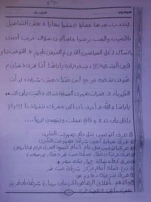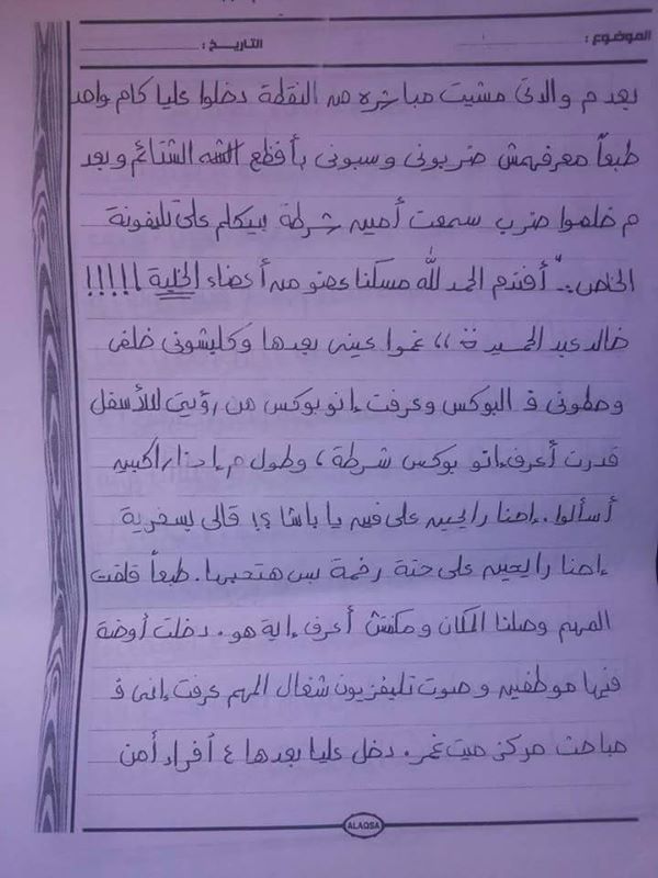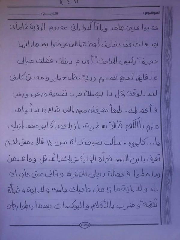 ونوه المعتقل في رسالته، إلى اضطراره الاعتراف، لشدة التعذيب الذي يتعرض له، إضافة إلى إرشاده الأمن عن أماكن زملائه، الذي تعرضوا لاحقًا للاعتقال.