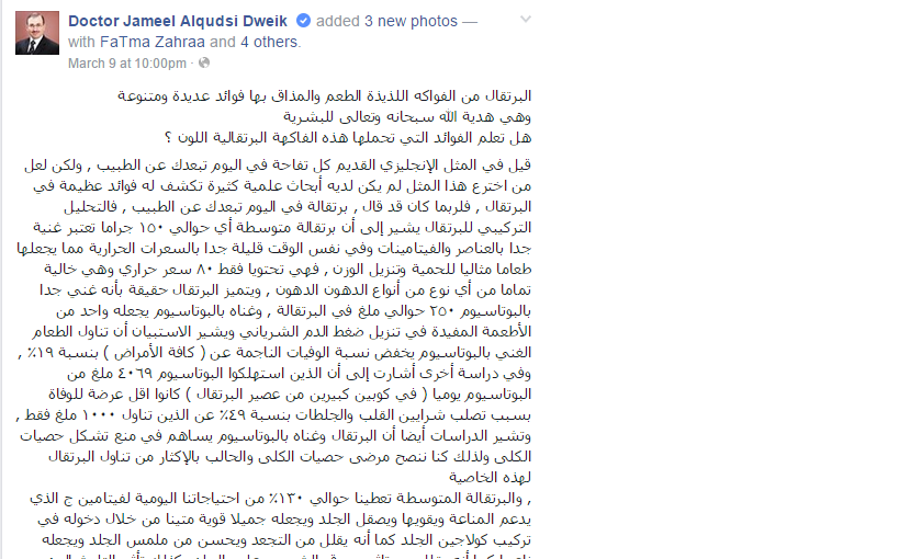 القدسي أشار إلى أن تناول البرتقال أبرز ما يمكن أن نتناوله خلال حميتنا، وقال عبر صفحته على موقع التواصل الاجتماعي الفيس بوك إن برتقالة متوسطة أي حوالي ١٥٠ جرامًا تعتبر غنية جدًا بالعناصر والفيتامينات وفي نفس الوقت قليلة جدًا بالسعرات الحرارية مما يجعلها طعامًا مثاليًا للحمية وتنزيل الوزن فهي تحتوي فقط ٨٠ سعر حراري وهي خالية تمامًا من أي نوع من أنواع الدهون.
