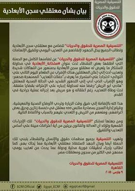 ودعت التنسيقية جميع منظمات حقوق والإنسان والنشطاء لتبني تلك الحملة أيضا، وبذل الجهد لاستنقاذ معتقلي الأبعادية مما يُحاك بهم، كما تطالب بإجراء تحقيقات فورية محلية ودولة عما يحدث من تعذيب يومي ممنهج في كثير من سجون ومعتقلات مصر.