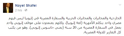 كشف المهندس نائل الشافعي، مدير موسوعة المعرفة والمحاضر في معهد ماساتشوستس للتقنية، أن الخارجية والمخابرات والمخابرات الحربية والسفارة المصرية في إثيوبيا ليس فيها مصري واحد يتكلم الأمهرية (لغة إثيوبيا).