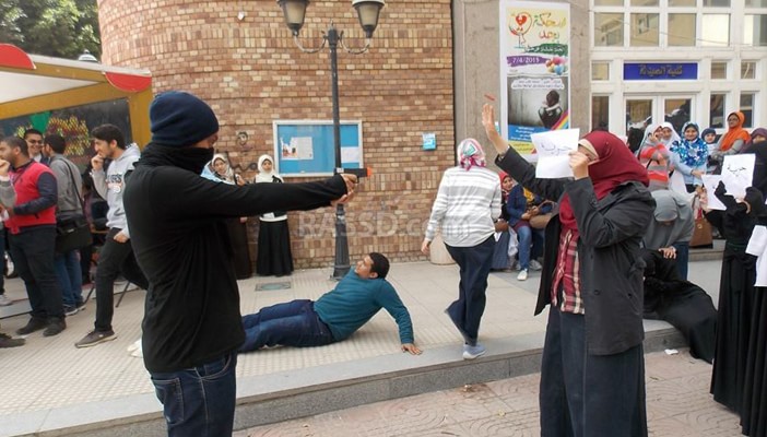 نظم طلاب بجامعة الإسكندرية، عرضًا صامتًا (فريزينج) بساحة كلية الصيدلة، يوضح انتهاكات قوات الأمن بحق معارضي الحكم العسكري.