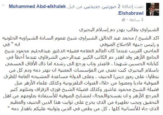 وقال "الشبراوى" على صفحته على "فيس بوك": "فى الماضى القريب عندما أهدر العالم العلامة الدكتور عبد الحليم محمود شيخ الجامع الأزهر دم الكاتب الكبير عبد الرحمن الشرقاوى لخطأه فى كتاباته "الحسين شهيدًا"، فاعتذر وتاب ورجع إلى رشده".