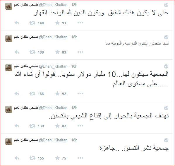 وأشار في مجموعة تغريدات عبر حسابه على تويتر إلى أن جمعية "نشر التسنن" جاهزة، وهي جمعية أهلية تهدف بالحوار، إلى إقناع الشيعي بالتسنن، مضيفًا أن ميزانية هذه الجمعية 10 مليارات دولار سنويًا على مستوى العالم، وأن هناك متحدثون يتقنون الفارسية والعربية معًا يعملون بها.