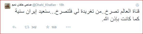 وأكد ضرورة إعادة إيران "سنية" كما كانت، قائلاً: "قناة العالم تصرخ من تغريدة لي فلتصرخ.. سنعيد إيران سنية كما كانت بإذن الله".