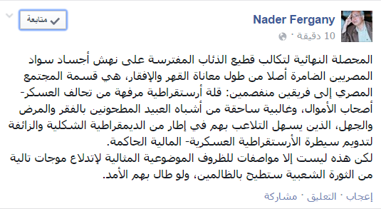 وفي تدوينة له على موقع التواصل الاجتماعي “فيس بوك”، قال “فرجاني” إن “المحصلة النهائية لتكالب قطيع الذئاب المفترسة على نهش أجساد سواد المصريين الضامرة أصلًا من طول معاناة القهر والإفقار، هي قسمة المجتمع المصري إلى فريقين منفصمين: قلة أرستقراطية مرفهة من تحالف العسكر/ أصحاب الأموال، وغالبية ساحقة من أشباه العبيد المطحونين بالفقر والمرض والجهل، الذين يسهل التلاعب بهم في إطار من الديمقراطية الشكلية والزائفة لتدويم سيطرة الأرستقراطية العسكرية/ المالية الحاكمة”.