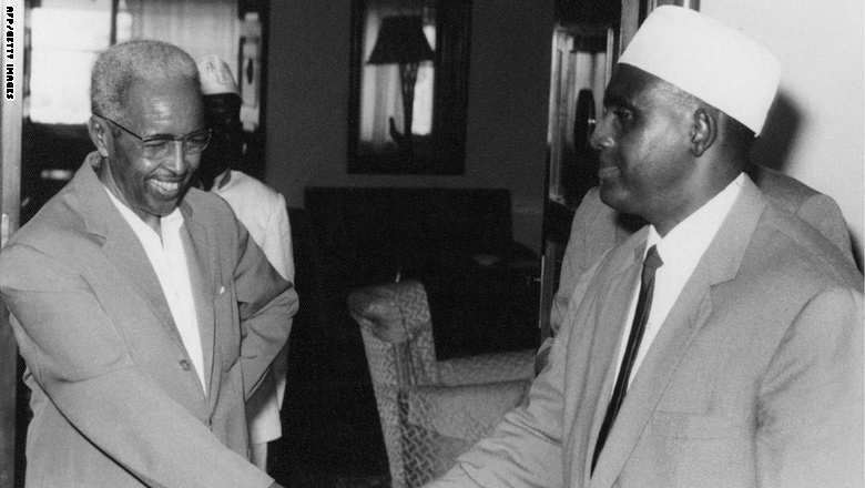 عدن عبدالله عثمان، أول رئيس للصومال، مع رئيس وزرائه عبدالرشيد علي شرمارك، في العاصمة الصومالية مقديشو، في 26 يونيو 1960.