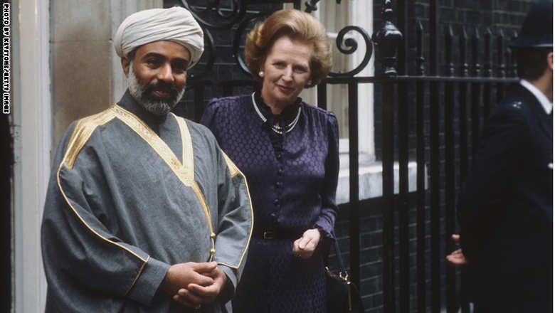 سلطان عمان، قابوس بن سعيد، أقدم حاكم عربي على قيد الحياة، مع رئيسة وزراء بريطانيا مارغريت تاتشر، في مارس 1982.