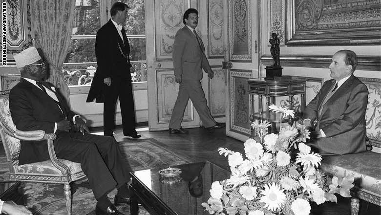 الرئيس الجيبوتي حسن جوليد أبتيدون، أول رئيس للبلاد بعد استقلالها، مع الرئيس الفرنسي جاك شيراك، في قصر الإليزية بباريس، في الثامن من أغسطس 1986.