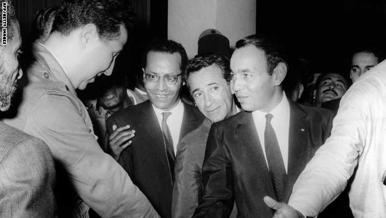 عاهل المغرب الراحل، الملك الحسن الثاني (يمين)، يُصافح الرئيس الجزائري الراحل، أحمد بن بلا في المغرب، بعد توقيع اتفاق هدنة، عام 1963.