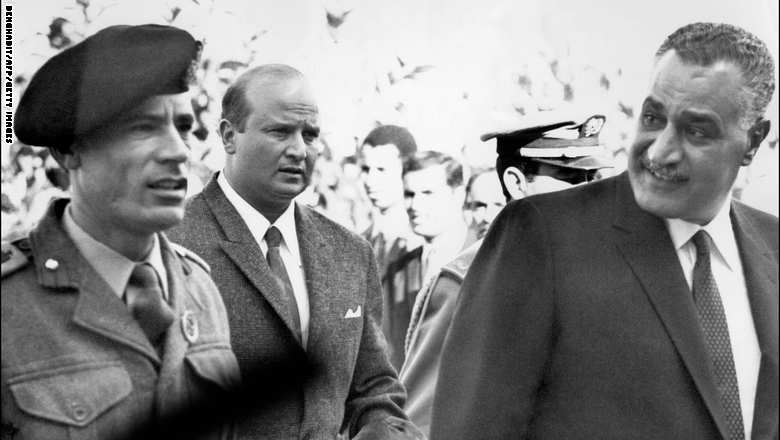 الرئيس الليبي معمر القذافي، باللباس العسكري، مع الرئيس الراحل جمال عبدالناصر، في العاصمة المغربية الرباط، عام 1963.