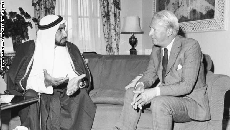 الشيخ زايد بن سلطان آل نهيان، مؤسس دولة الإمارات العربية المتحدة، رفقة رئيس الوزراء البريطاني إدوارد هيث، في فندق دورتشيستر، بلندن، في يونيو 1969.