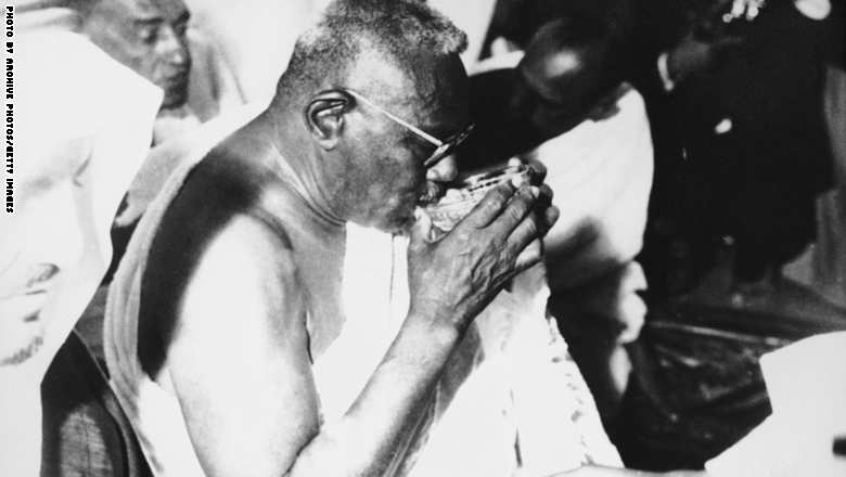 إسماعيل الأزهري، أول رئيس للسودان، بعد الاستقلال، يشرب من ماء زمزم خلال الحج في مكة المكرمة، في السادي من ديسمبر 1966.