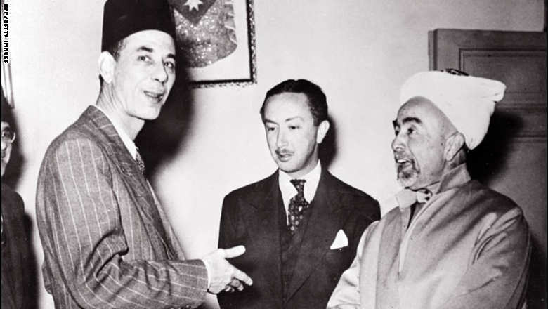 ملك الأردن الراحل، عبدالله الأول بن الحسين، على يمين الصورة، يتحدث مع عبدالرحمن عزام، الأمين العام لجامعة الدول العربية، وبينهما الأمير عبدالإله بن علي، وصيّ عرش العراق، في 15 مايو 1948.
