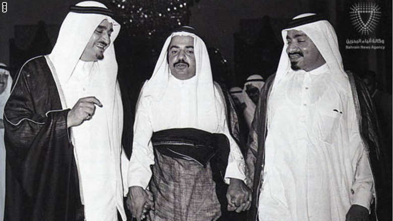 رئيس الوزراء البحريني (وسط)، والعاهل السعودي الراحل، الملك فهد بن عبدالعزيز آل سعود، في زيارة إلى دولة قطر، لتقديم التهاني إلى نائب الحاكم وولي العهد، آنذاك الشيخ خليفة بن حمد آل ثاني، بمناسبة إعلان استقلال دولة قطر في الرابع من سبتمبر 1971.