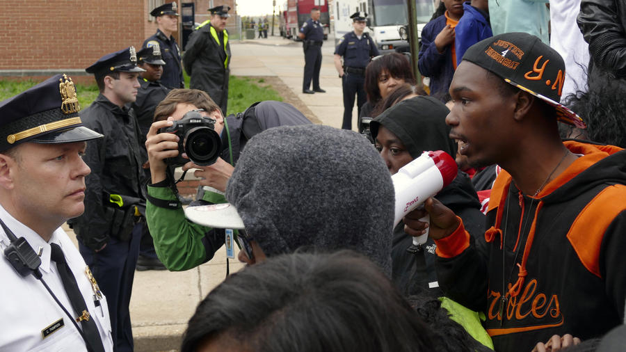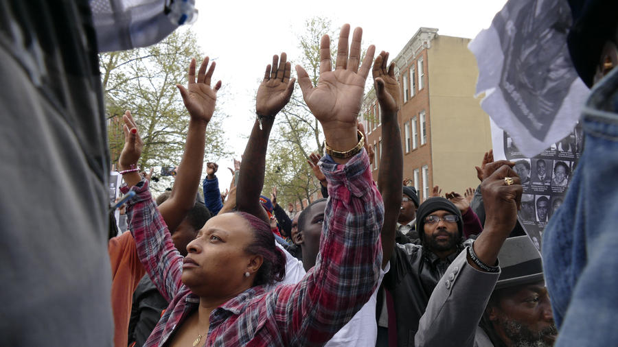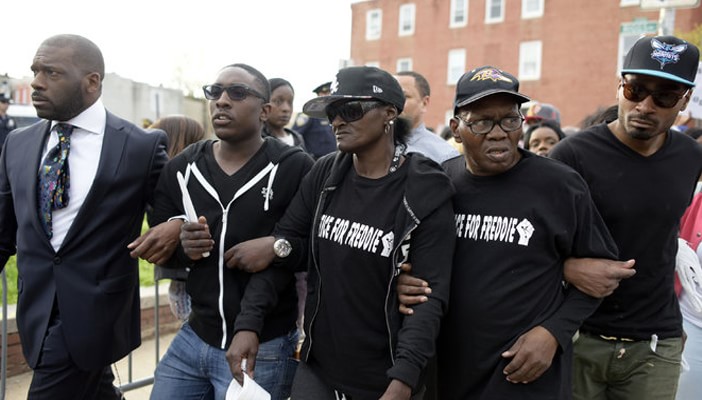 تظاهر مئات الأمريكيين بمدينة بالتيمور في ولاية ميريلاند احتجاجاً على وفاة الشاب الأسود فريدي جراي في المستشفى الأحد الماضي متأثراً بجراحه التي أصيب بها أثناء اعتقاله من قبل الشرطة الأمريكية الأسبوع الماضي