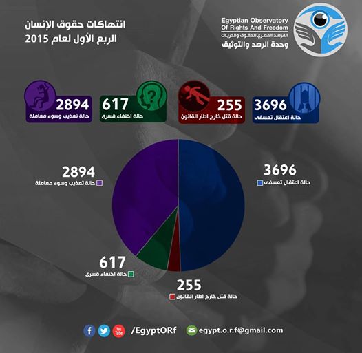 وأوضحت وحدة الرصد والتوثيق بالمرصد المصري، أن الربع الأول من العام 2015 شهد انتهاكات جسيمة لحقوق الإنسان ترتقى إلى جرائم ضد الإنسانية لا تسقط بالتقادم.