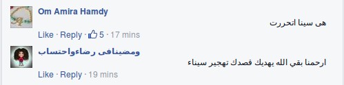 ومن جانبها تساءلت أميرة حمدي، “هي سينا اتحررت علشان نحتفل”، وأضافت كل يوم بيموت عساكر ومواطنين، والمتحدث العسكري يطلع يقول دمرت عشش ومخازن سلاح، وفي الآخر برضو الإرهاب لسه شغال”.