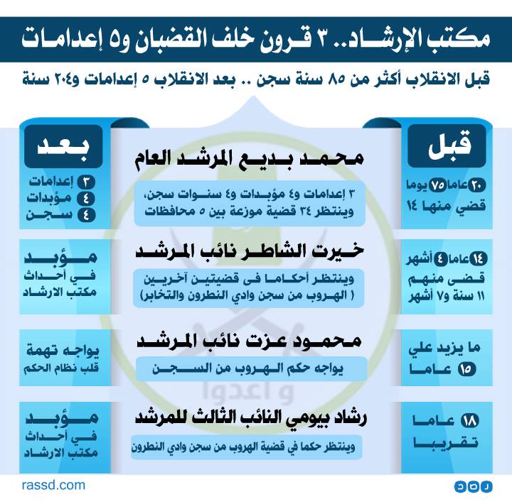 إنفوجراف.. مكتب الإرشاد: 3 قرون خلف القضبان و5 إعدامات (1 – 2)