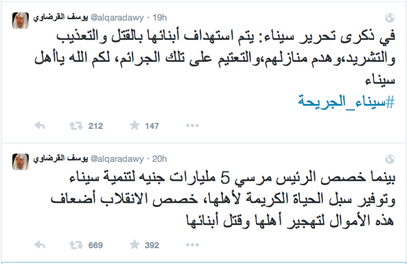 وقال القرضاوي -فى تغريدة له عبر موقع “تويتر”-: إن الرئيس محمد مرسي خصص خمسة مليارات جنيه لتنمية سيناء وتوفير سبل الحياة الكريمة لأهلها، في الوقت الذي خصص فيه الانقلاب أضعاف هذا المبلغ لتهجير شعبها وقتل أبنائها.