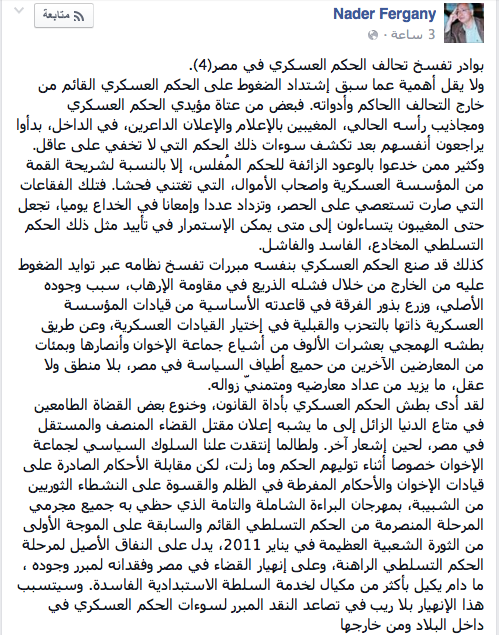 وشدد فرجاني أن الحكم العسكري صنع بنفسه مبررات تفسخ نظامه عبر تزايد الضغوط عليه من الخارج من خلال فشله الذريع في مقاومة الإرهاب، وهو سبب وجوده الأصلي، وزرع بذور الفرقة في قاعدته الأساسية من قيادات المؤسسة العسكرية ذاتها بالتحزب والقبلية في اختيار القيادات العسكرية، وعن طريق بطشه الهمجي بعشرات الألوف من أشياع جماعة الإخوان وأنصارها، وبمئات من المعارضين الآخرين من حميع أطياف السياسة في مصر، بلا منطق ولا عقل، ما يزيد من عداد معارضيه ومتمنيّ زواله.