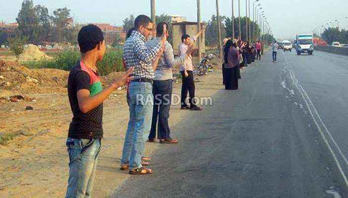 ونظم اهالي الشهداء سلسلة بشرية ضد الانقلاب على طريق الشهداء دراجيل رافعين شارات رابعة