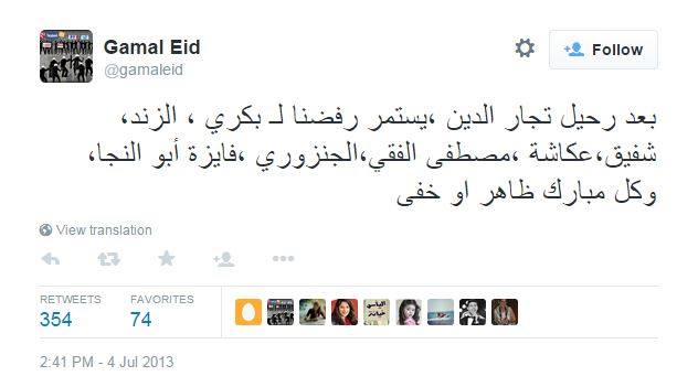 كذلك كان لجمال عيد، الناشط السياسي، تدوينة على “تويتر”، أعلن فيها رفضه لعدة شخصيات محسوبة على نظام المخلوع حسني مبارك، وكان منهم الزند، وكان بتاريخ يوليو 2013.
