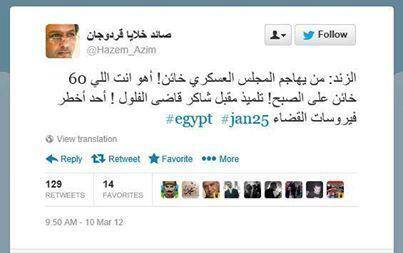 ولحازم عبد العظيم،الناشط السياسي، أحدى المهاجمين لجماعة الإخوان المسلمين، تدوينة على “تويتر”، هاجم خلالها “الزند”، حينما صرح بأن كل من يهاجم الحكم العسكري خائن، وذلك في مارس 2012، ووصفه بقاضي الفلول.