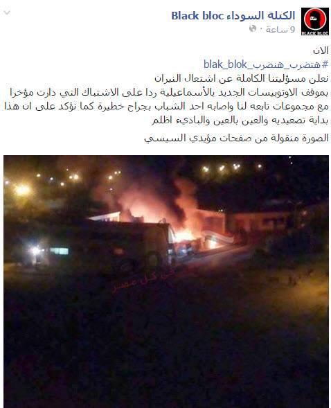 أعلنت صفحة الكتلة السوداء “بلاك بلوك” على موقع التواصل الاجتماعي “فيسبوك” في الساعات الأولى من صباح اليوم الثلاثاء، مسؤوليتها عن حادث حرق 5 أتوبيسات من النقل الداخلي بمحافظة الإسماعيلية.