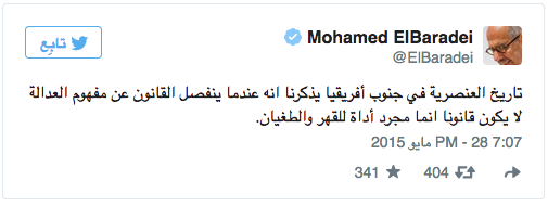كتب الدكتور محمد البرادعى، مؤسس حزب الدستور، خلال تغريدة له على موقع التدوينات القصيرة “تويتر” أن “تاريخ العنصرية فى جنوب أفريقيا يذكرنا أنه عندما ينفصل القانون عن مفهوم العدالة لا يكون قانونا إنما مجرد أداة للقهر والطغيان”.